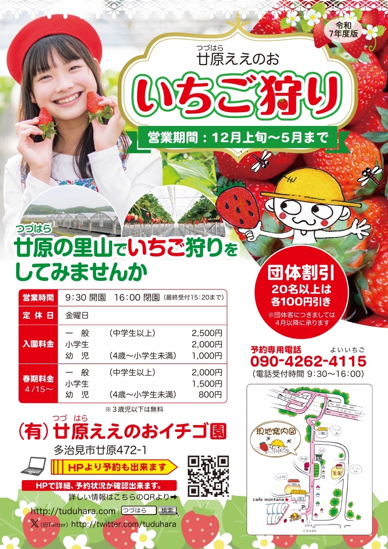 | アクセス | 自動車で中央自動車道多治見ICから、国道19号経由 もしくは同248号経由で県道を経て約20分。 ※土、日、祝はJR中央線の古虎渓駅と廿原ええのお 間を往復するバスが運行します。 ◎時刻表は多治見市の公式サイトへ https://www.city.tajimi.lg.jp/kurashi/toshikekaku/kotsu/suwa.html ◎PDFファイル https://www.city.tajimi.lg.jp/kurashi/toshikekaku/kotsu/documents/suwasendonichi.pdf 国道19号線からイチゴ狩り会場に向かうための案内板を立てることが出来なくなりましたのでアクセスページをご覧ください。 |